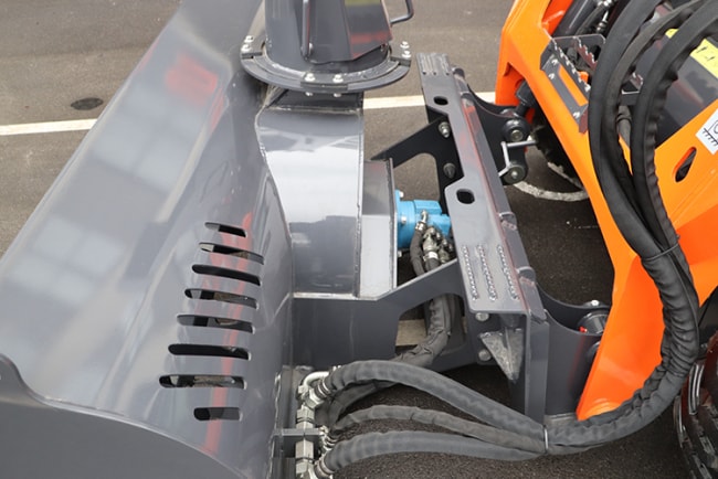 Attachments are quickly secured using pins and locking mechanisms, allowing for tool-free attachment changes in minutes and improving operational flexibility.