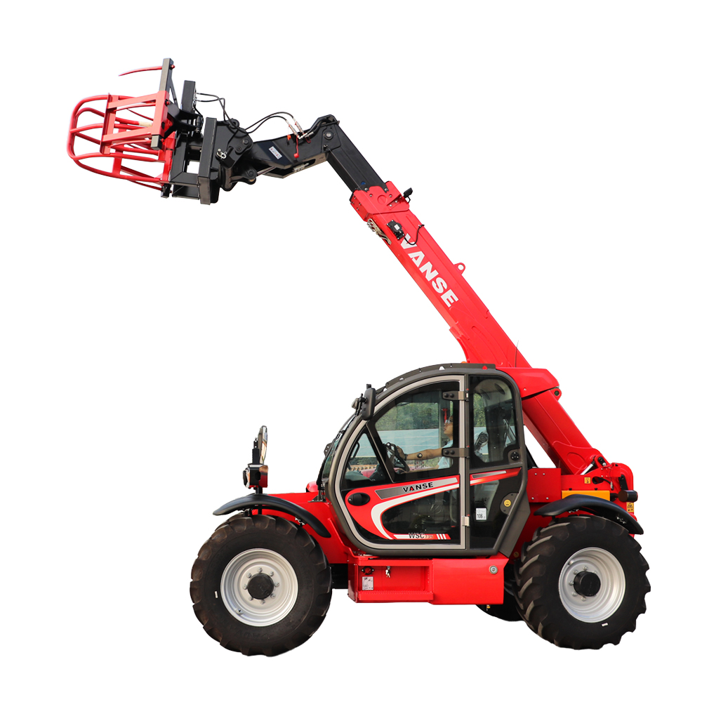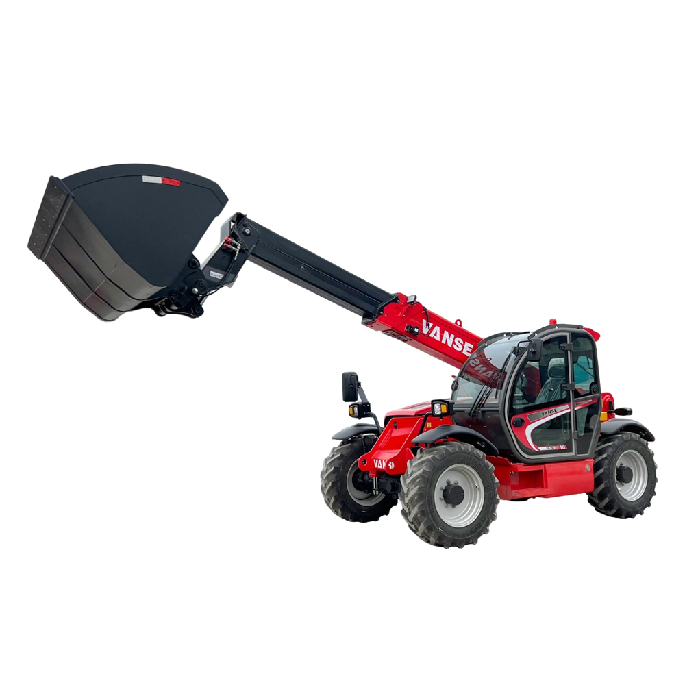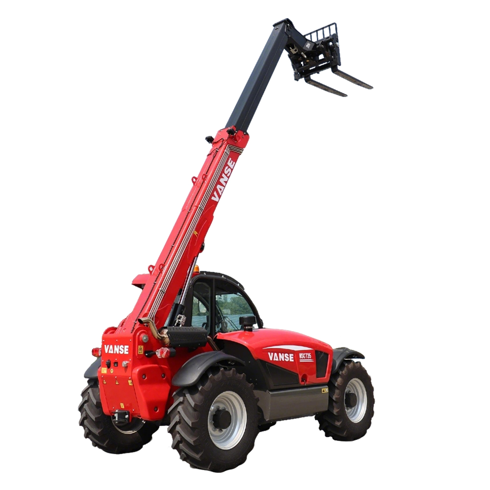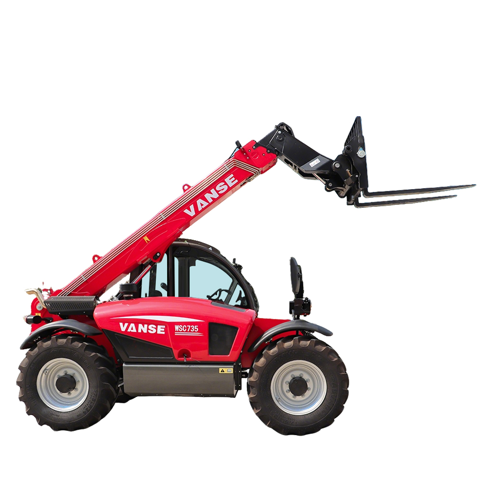 O manipulador telescópico VANSE 735 de 7 metros atende aos requisitos de trabalhos de médio porte, consolidando-se como peça-chave em construção, agricultura, logística e armazenagem graças à combinação ideal de carga nominal de 3,5 toneladas e altura máxima de elevação de 7 metros. Equipado com motor diesel potente de 77,3 kW, oferece amplas reservas de potência. Aliado a um sistema hidráulico inteligente de detecção de carga de 160 L/min, proporciona extensão e retração rápidas do braço principal, além de elevação e descida suaves de cargas, reduzindo significativamente os ciclos de trabalho. A máquina conta com eixo dianteiro rígido e eixo traseiro oscilante, combinados a pneus off-road 440/80R24, que garantem grande área de contato e aderência superior. Sua capacidade de escalada de 30% assegura operação estável em rampas, terrenos lamacentos e superfícies complexas. Inclui cabine de segurança ROPS-FOPS Nível 2 e sistema de controle antirrolo, protegendo integralmente o operador. Opcionais como cabine climatizada e sistema de troca rápida de acessórios permitem alternância ágil entre garfos e caçambas, viabilizando operações integradas de empilhadeira e carregadeira, com expansão de aplicações.