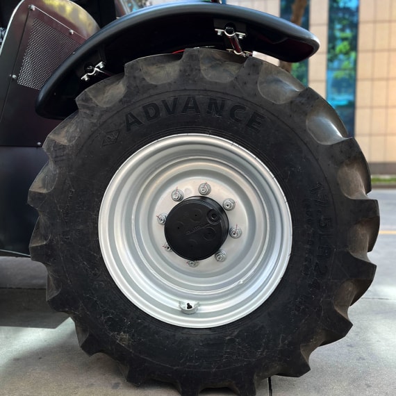 Pneus de engenharia de banda larga com sulcos profundos e aderência superior, ideais para terrenos lamacentos, cascalhados e outras condições complexas, evitando derrapagens e atolamentos. Aros reforçados oferecem alta capacidade de carga. Protetores de lama curvos nas juntas protegem a pintura e os componentes essenciais do veículo.